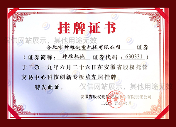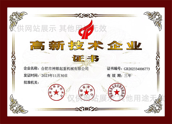 合肥神雕起重是高新技術(shù)企業(yè),是安徽省科創(chuàng)板掛牌企業(yè)(證券代碼:630331),同時榮獲安徽市場質(zhì)量、誠信五星級企業(yè)、合肥經(jīng)濟圈示范企業(yè)、合肥市創(chuàng)新型企業(yè)、安徽省市場質(zhì)量放心產(chǎn)品等榮譽稱號